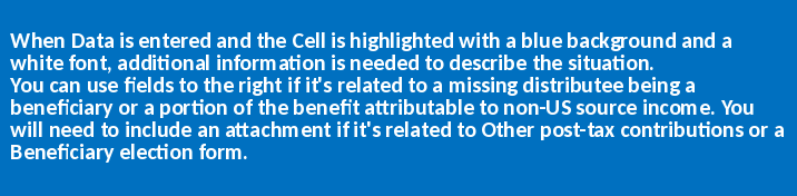 Missing distributee's name Date of birth Social Security Number (enter w-o dashes) Last-known address Other name(s) ever used Type of distributee Prior payments Non-U.S. Source Income Employee contributions Amended filing Benefit transfer Administrative fee Late payment Lump sum eligibility Normal retirement Monthly SLA @ BDD Monthly Single Life Annuity payable at various ages