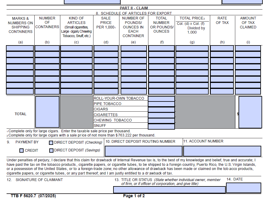 In response to E.O. 14247, TTB is revising form TTB F 5620.7 to add Item 9, which will allow the respondent to select payment of the claimed excise tax drawback either by direct deposit to a checking or savings account or as a credit to be taken on their tobacco excise tax return. In addition, if the claimant selects the direct deposit option, TTB has added Items 10 and 11 to the form to collect, respectively, the respondent’s direct deposit routing number and bank account number. The addition of those three new Items also results in the renumbering of previous Items 9, 10, 11, and the subsequent Item numbers as necessary.