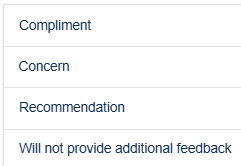 Would you like to provide additional feedback with a concern, compliment, or recommendation about your experience(s) with [Facility name]? Please select from one of the following options. Required