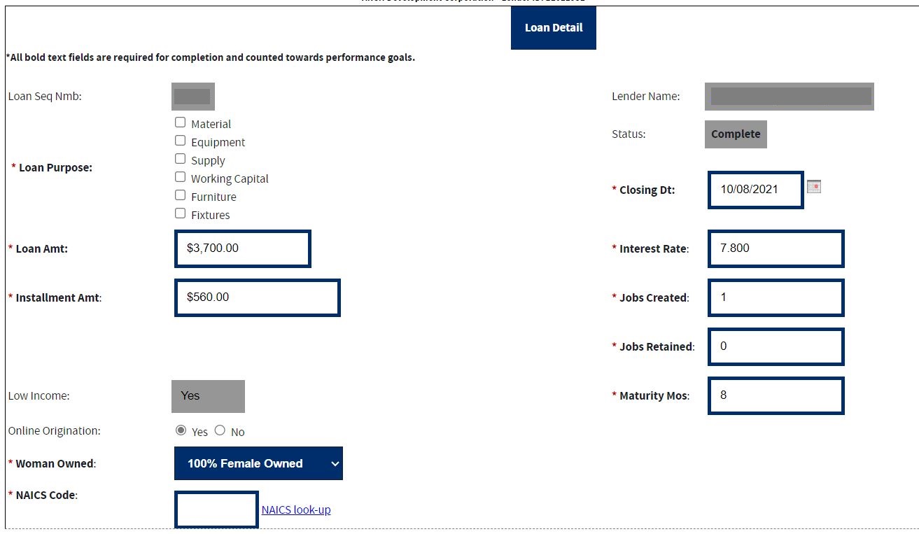 Microloan Information – Identifying information about loans that the Microlender makes. This includes Portfolio status information, percent of woman ownership in business, Loan Amount, Interest Rate and Terms, Loan Purpose, Installment Amount, Organization Type, NAICS Code, Urban/Rural Code, Number of Employees Created and Retained, SBA Loan Number and Lender Loan Number.