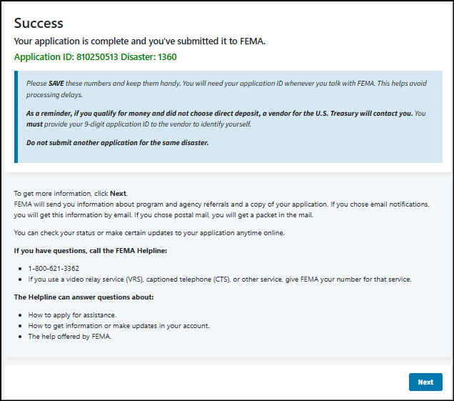 Please SAVE these numbers and keep them handy. You will need your application ID whenever you talk with FEMA. This helps avoid processing delays.