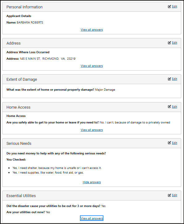 If you need to make changes, click Edit and go to the screen(s) you need. After you correct and save the information, you will return to this review.