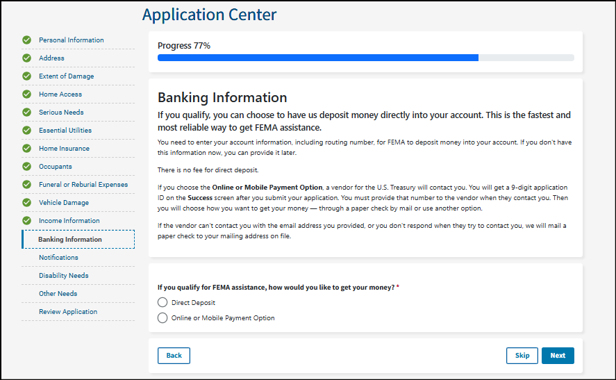 Note: FEMA assistance is limited. FEMA may only provide Serious Needs Assistance if you have damage to your home, your home is inaccessible, or you have an extended utility outage. Eligible households will receive a one-time payment of $770 for Serious Needs Assistance.