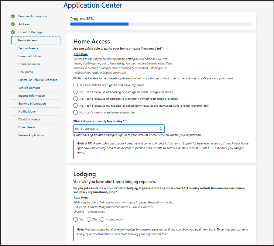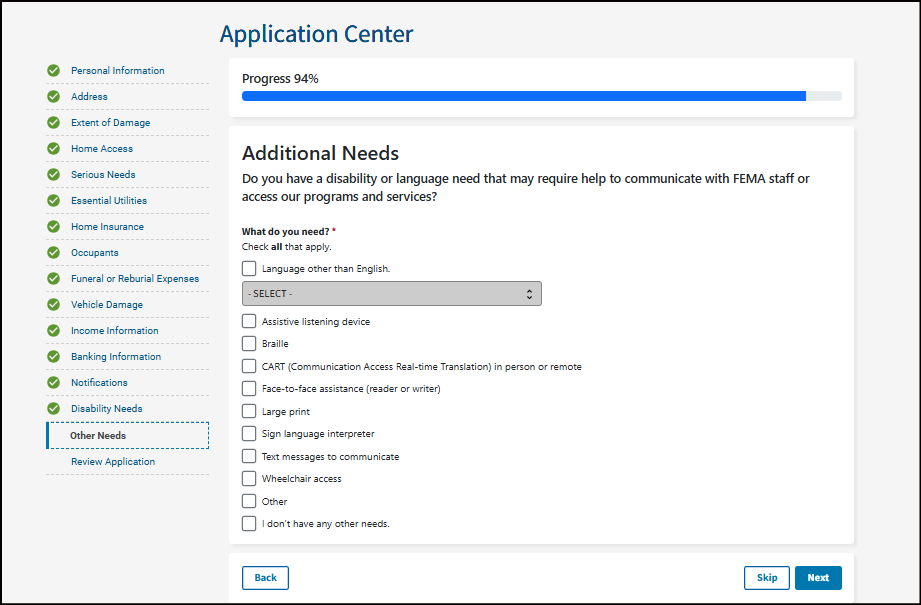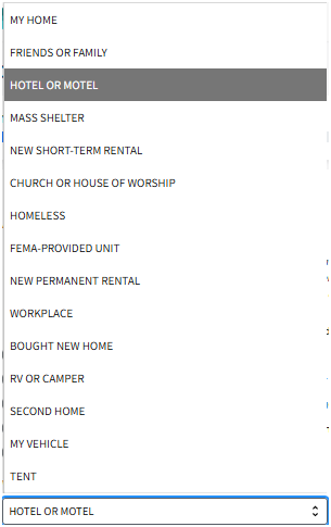 *Note: You don't need to have everything listed in each option. If even part of one choice fits your situation, choose it. If you do not check an option but later have that need, call FEMA or visit a Disaster Recovery Center to update your application.