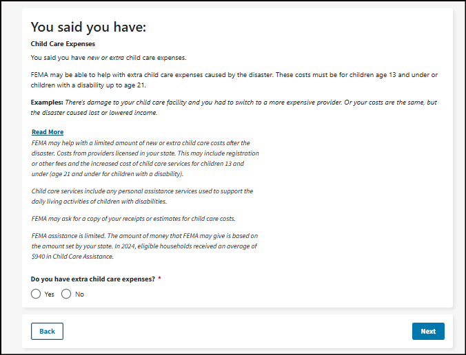 FEMA may be able to help with extra child care expenses caused by the disaster. These costs must be for children age 13 and under or children with a disability up to age 21.
