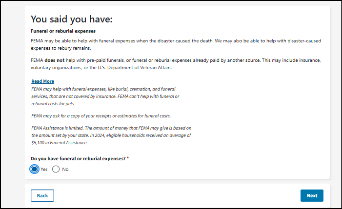 FEMA may be able to help with funeral expenses when the disaster caused the death. We may also be able to help with disaster-caused expenses to rebury remains.