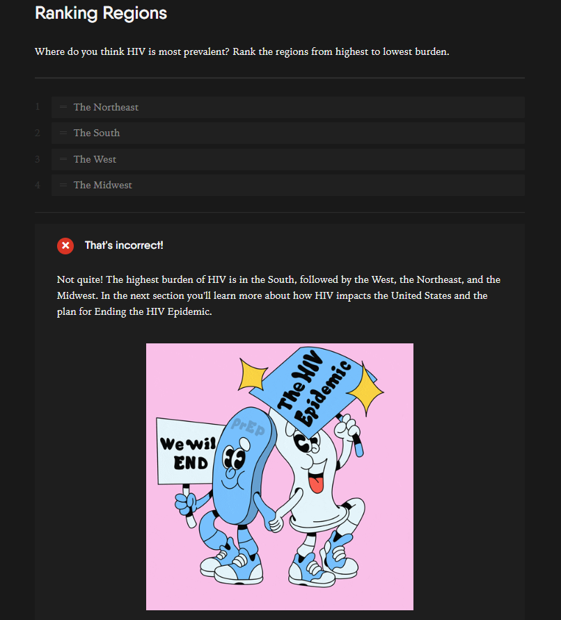 This module describes the HIV epidemic in the United States highlighting the Ending the HIV Epidemic (EHE) plan, reviews Pre-exposure Prophylaxis (PrEP) uptake in the United States, and PrEP’s effectiveness. One of the interactive elements in this module is called Ranking Text. We ask providers to rank regions of the United States based on where they think HIV is most prevalent. If the provider ranks the text correctly or incorrectly, they will see an explanation. In the screenshot below, the text was ranked incorrectly.