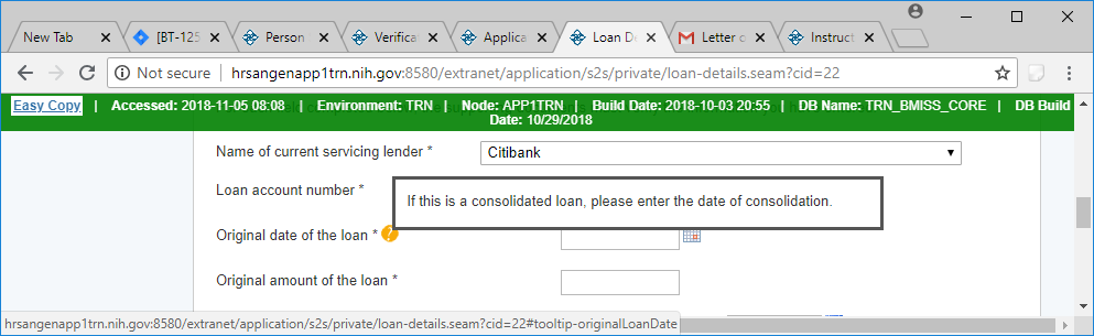 If the loan is a consolidated loan then instructions for required documentation is displayed and a drop down for the number of loans that were consolidated.
