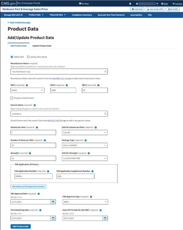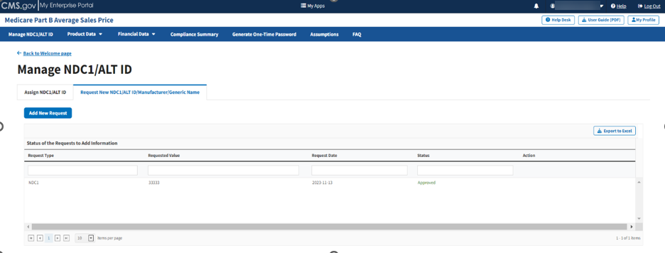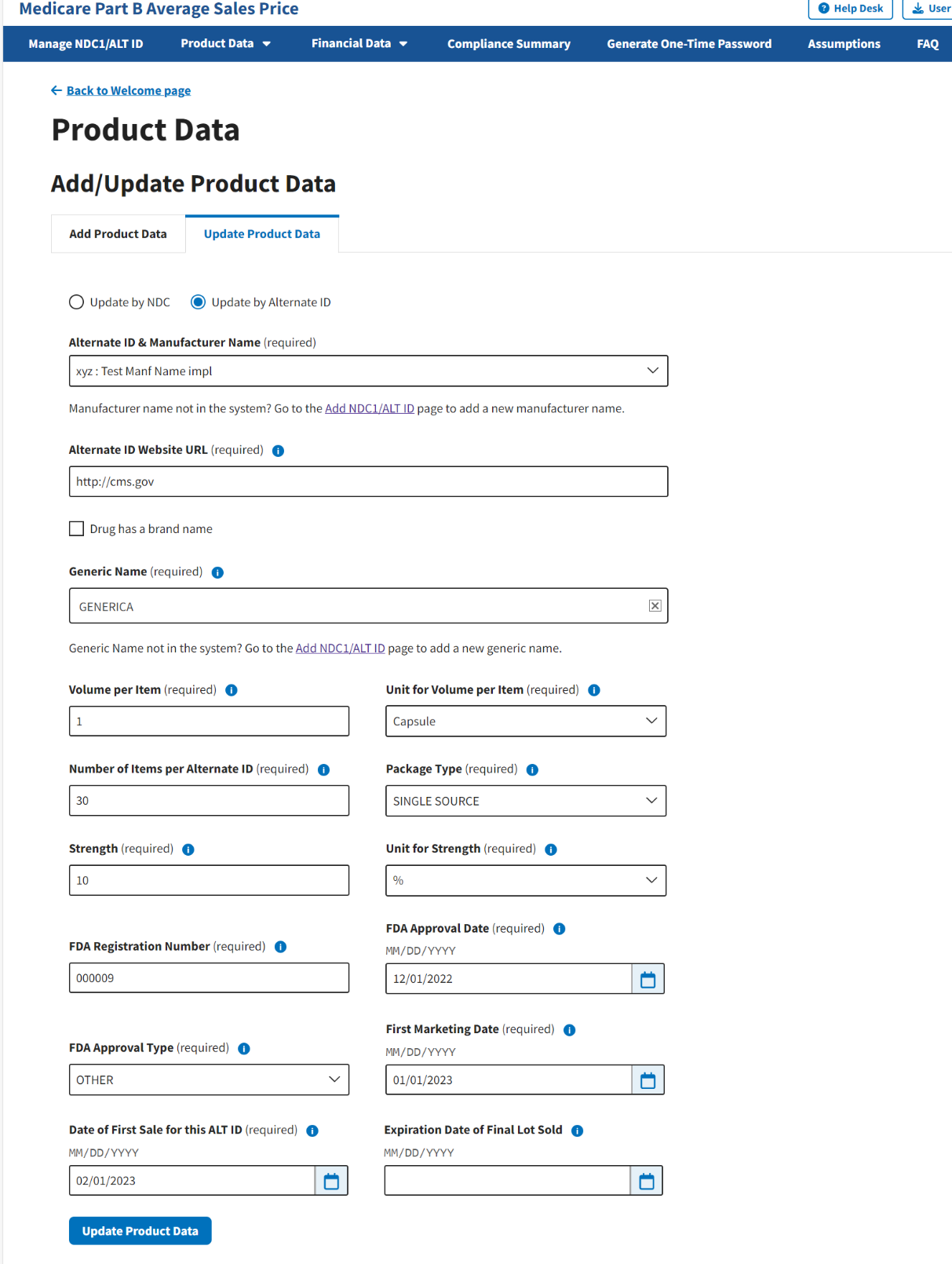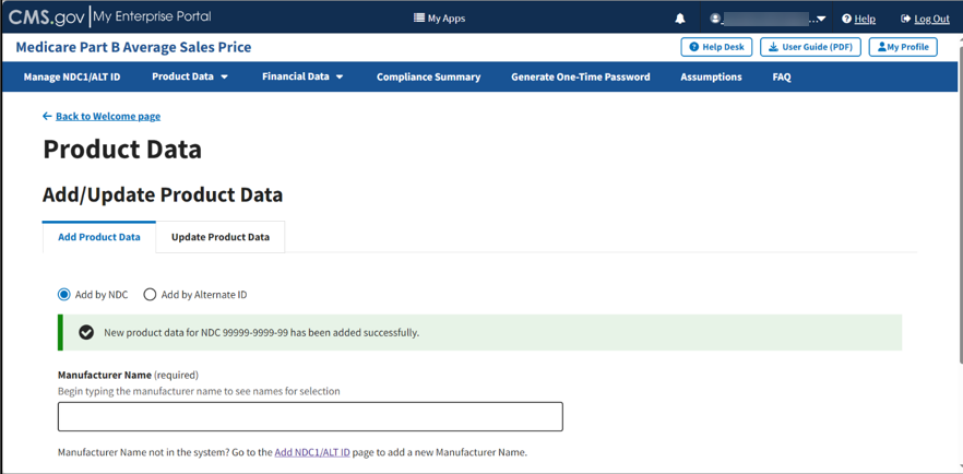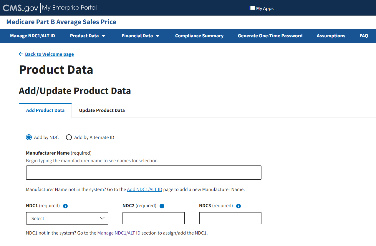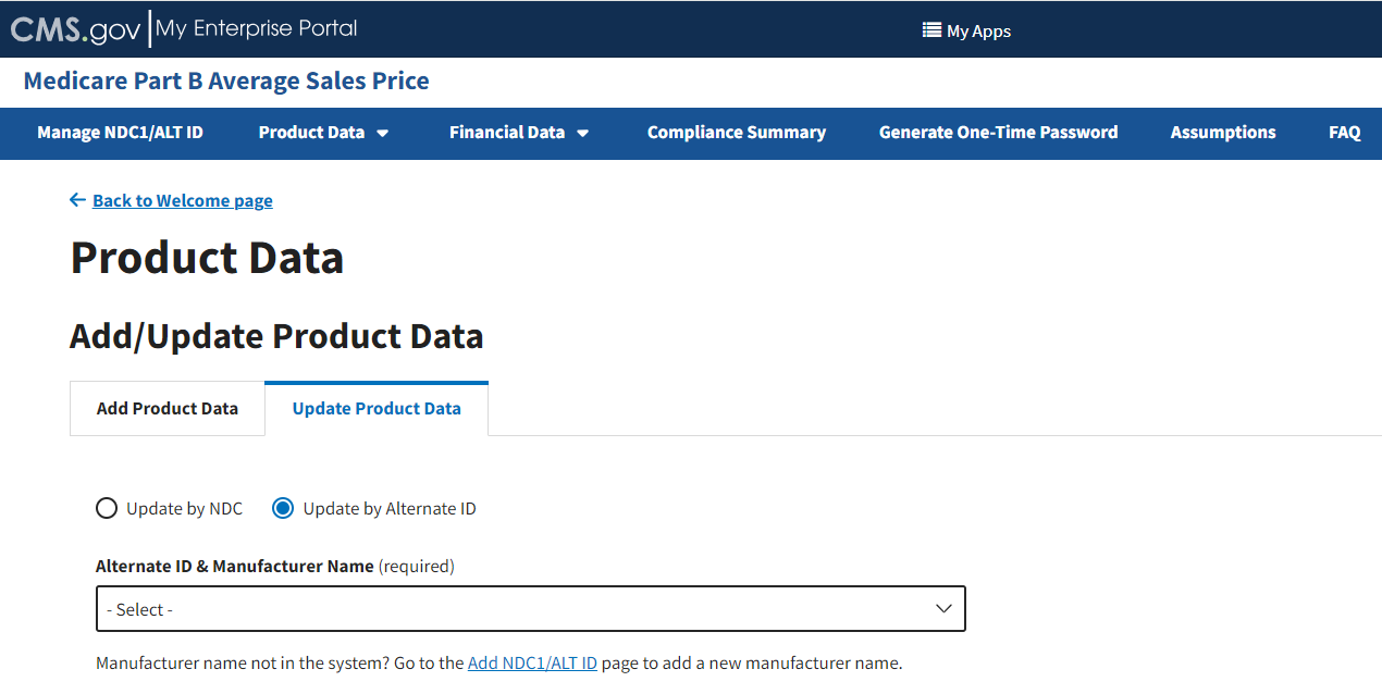 From the Medicare Part B Average Sales Price homepage, click the Manage NDC1/ALT ID tab.