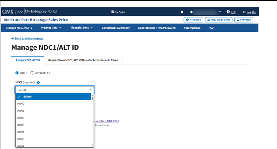Figure 10: Manage NDC1/ALT ID Page - Assign NDC1 Drop-down Menu