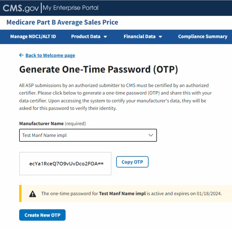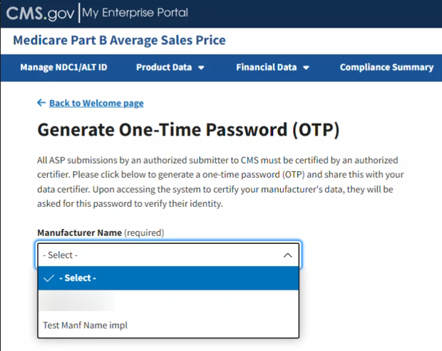 The following sections describe the functionality of each menu tab on the ASP homepage, including Manage NDC1/ALT ID, Product Data, Financial Data, Compliance Summary, Generate One-Time Password, Assumptions and FAQ.