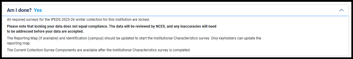 Once all edits and QC reviews are resolved/explained, for all data files, the survey component can be locked/submitted.