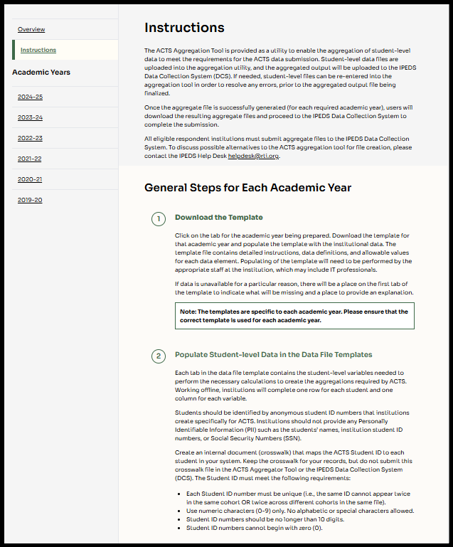 Please note that the aggregation will occur on a secure, RTI-hosted cloud-based web platform. Unit level data will never leave the platform and will be deleted once the data collection is completed. Only aggregated data files will be transferred to the IPEDS data collection system, hosted on Department of Education servers. Most users will find the web application easiest to use—it’s ready to go, requires no installation, and securely processes data in a FIPS 199 Moderate environment. However, if there is need to discuss alternative means of submitting the ACTS data, please contact the IPEDS Help Desk.