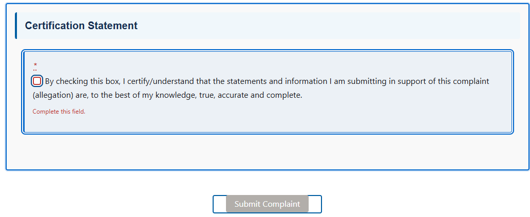 Series of check-mark boxes for the filer to select the complaint types and any/all complaint type allegations that apply |