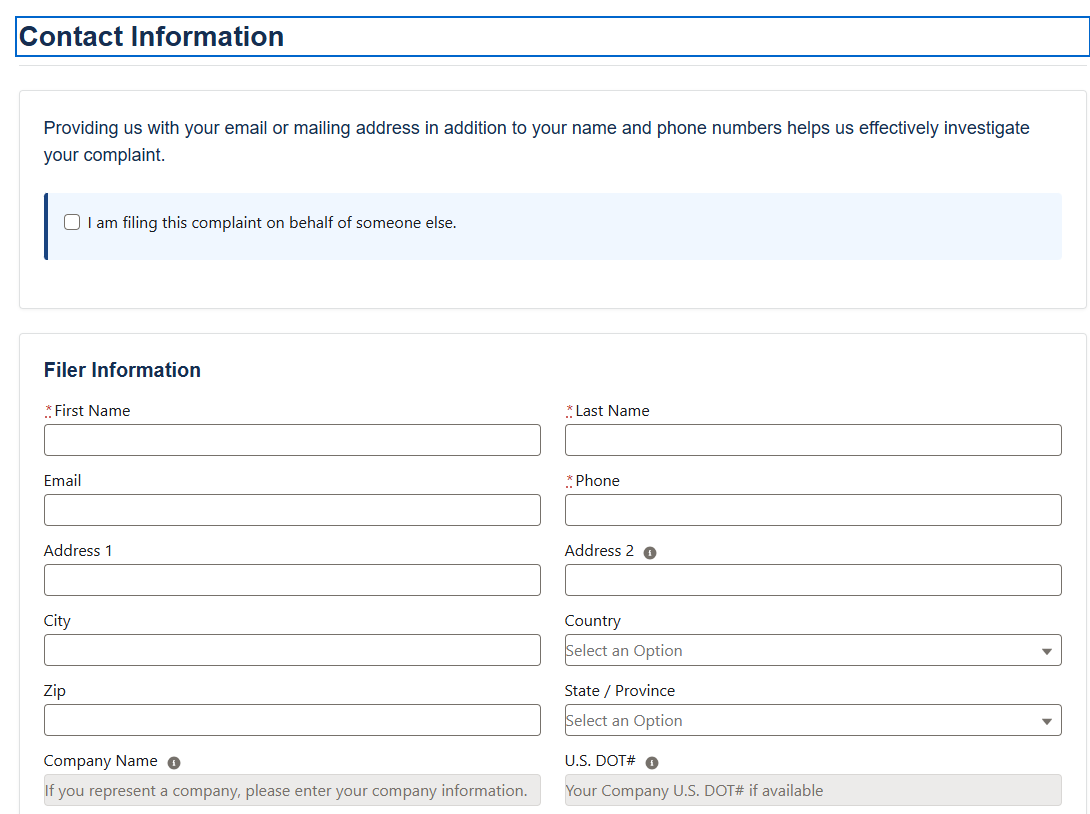 Yes/No selection to have the complaint information sent to the entity by FMCSA and if the filer wishes to have their contact information be released (or redacted) |