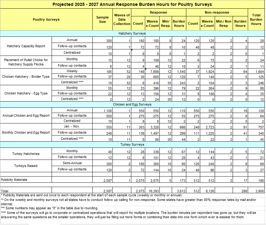 Poultry and egg numbers can change rapidly because of relatively short reproductive cycles (unlike cattle and hogs, for example). Collecting information less frequently would erode our list frame, result in less precise knowledge of production levels in the poultry industry, and eliminate data needed to keep federal and state agencies, agribusiness suppliers, and other data users abreast of industry changes.