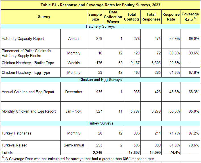 NASS’ poultry surveys can be separated into three groups based on target population: hatchery surveys target operations that hatch chickens or turkeys; chicken surveys target operations that raise pullets for hatcheries, broilers for meat production and pullets and layers for egg production; and turkey surveys target operations that raise turkeys for meat or egg production. Recent poultry sample sizes, response rates, and coverage rates (where response rates were less than 80 percent) are shown in Table B1.