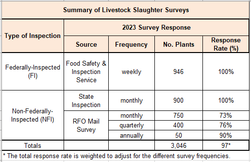 The table below summarizes recent population counts and response rates. The FI proportion of total commercial slaughter is typically very high each year. In 2022 approximately 98.1 percent of cattle, 98.1 percent of calves, 99.5 percent of hogs, and 84.9 percent of sheep slaughtered were federally inspected. Since the FI plants account for approximately 99.0 percent of all livestock slaughtered for red meat, the coverage-weighted response rate is nearly 100 percent.
