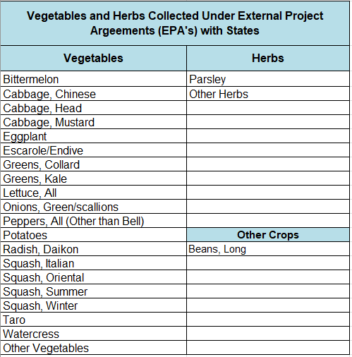 The following supplemental vegetable and herb data is collected under cooperative agreements with State cooperators. Rather than conducting two separate surveys, the additional data is collected using the same Federal questionnaires. The cooperators reimburse NASS for the additional data collection and processing costs.