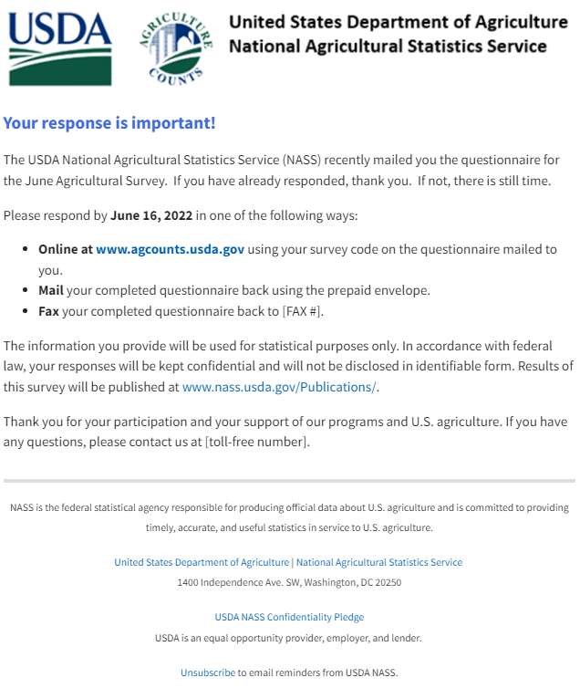 Example reminder electronic mail (E-Mail) sent to respondents who previously provided an email address.