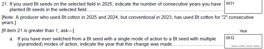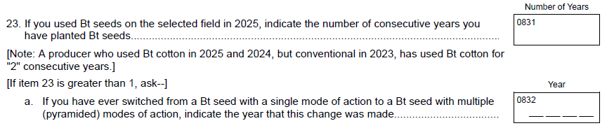 Question 21 (refuge to comply with Bt management guidelines) – Removed.