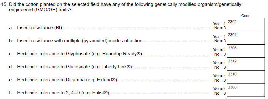 Question 9a “Measure damage from budworm & bollworm” – Removed.