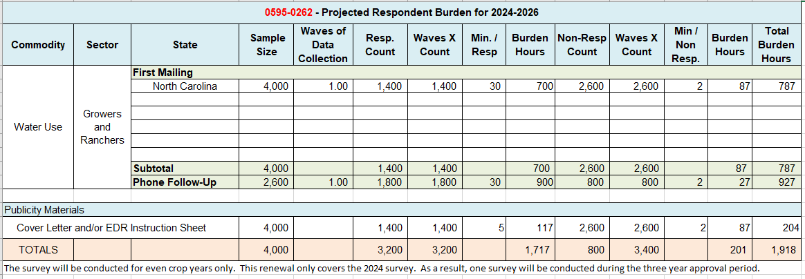 The projected annual cost to conduct the Water Use Survey is approximately $184,300 for each fiscal year, most of which is staff costs. The costs will be reimbursed by the North Carolina Department of Agriculture and Consumer Services. There will be no cost to the Federal government.