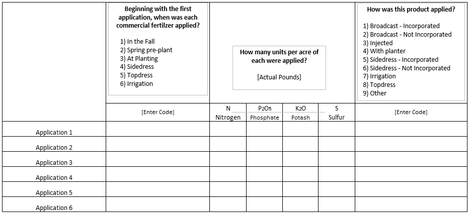 I will now ask you for all your commercial fertilizer applications made to this field for the 2026 crop year, again including any 2025 fall applications of commercial fertilizer. Each individual application will be recorded separately, preferably as units per acre.