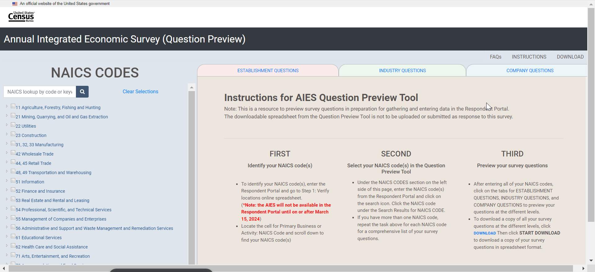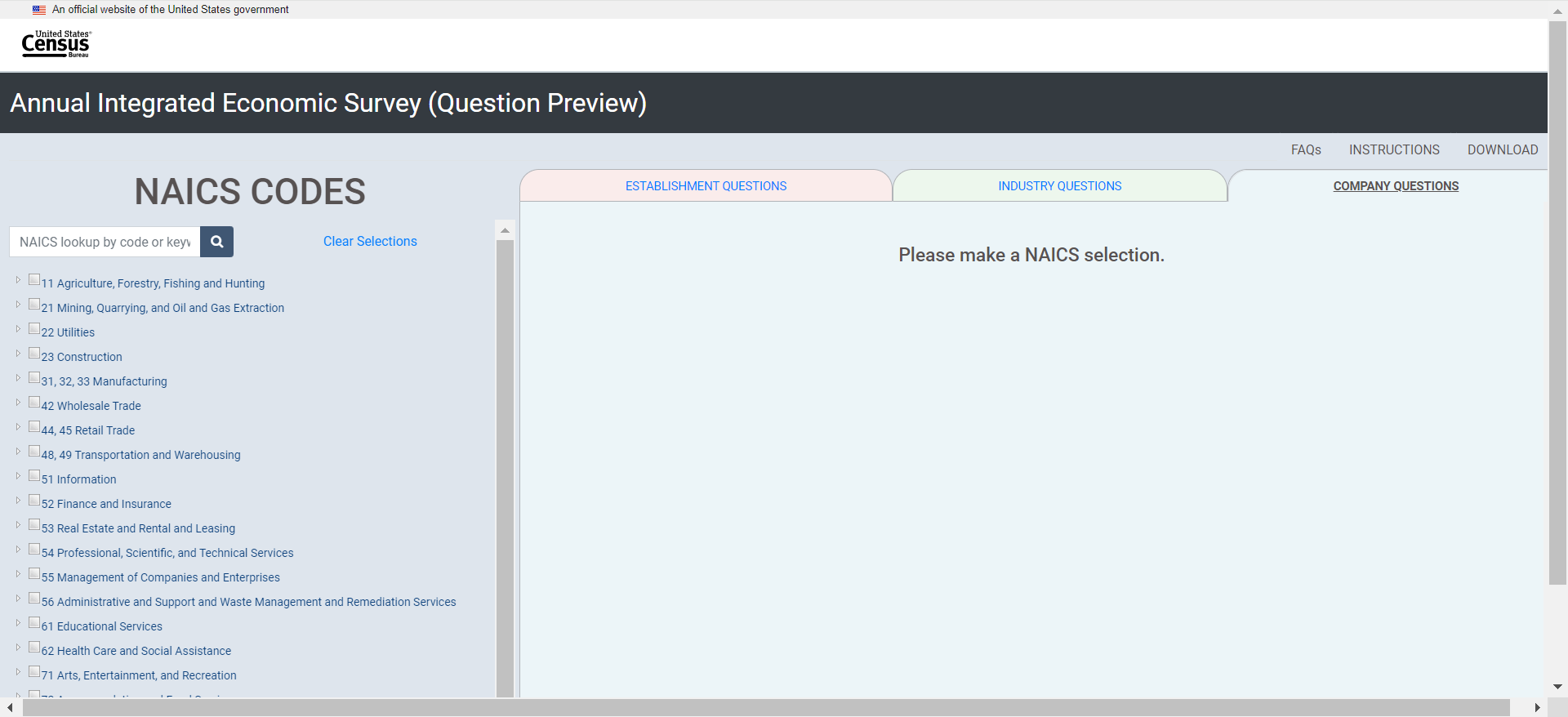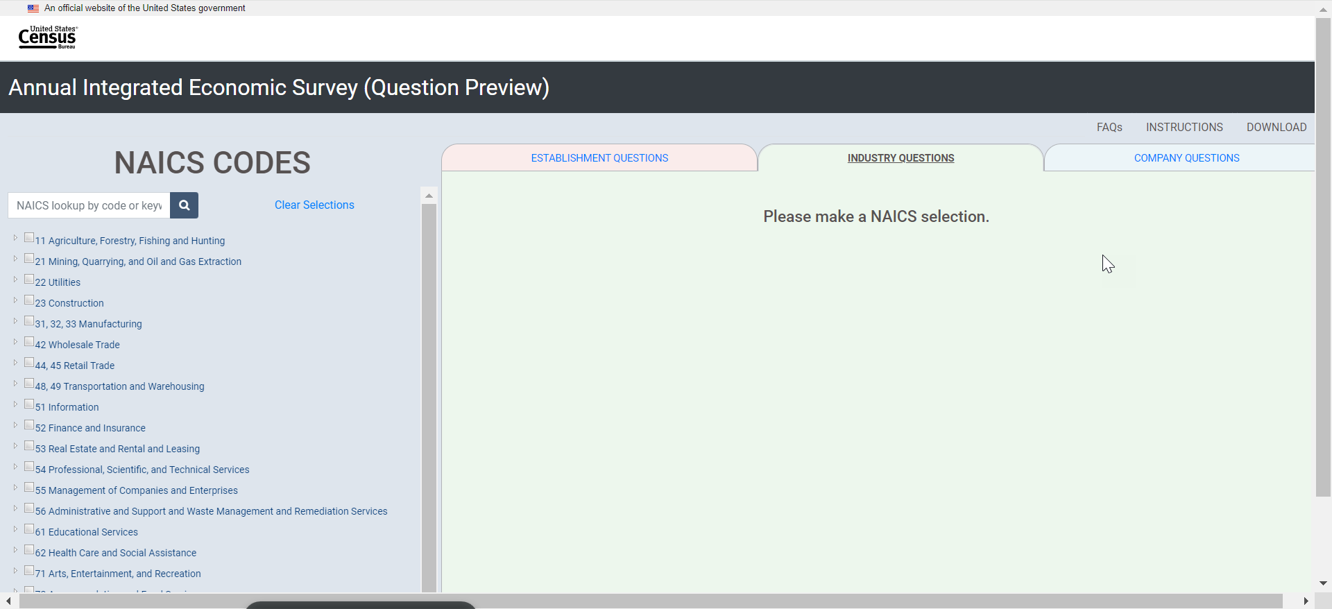 Establishment survey respondents often rely on a survey preview to support response. However, there is no designated survey form for the AIES as questions are specific to a company’s industry (or industries). As such, the Census Bureau developed an interactive content selection tool for previewing questions specific to a company’s assigned North American Industry Classification System (NAICS) code(s) to support response to the AIES.