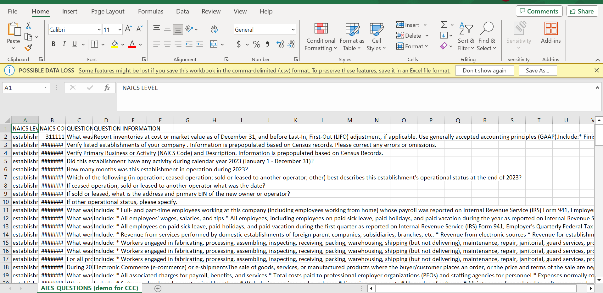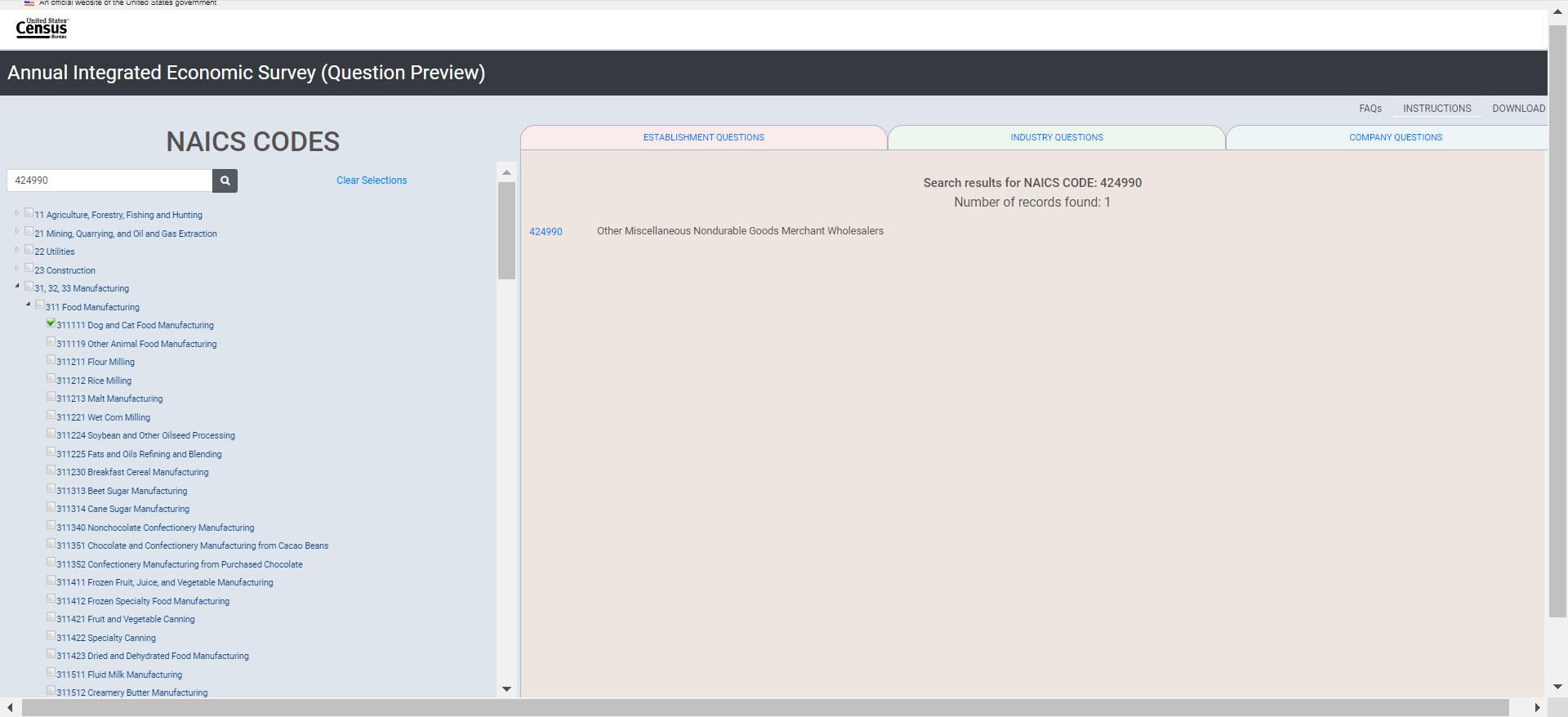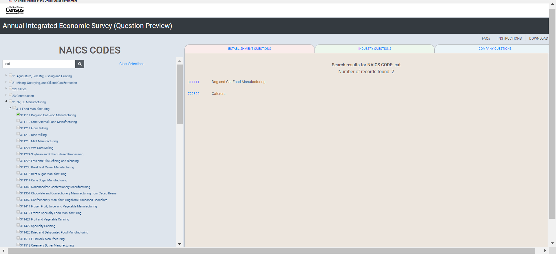 Establishment survey respondents often rely on a survey preview to support response. However, there is no designated survey form for the AIES as questions are specific to a company’s industry (or industries). As such, the Census Bureau developed an interactive content selection tool for previewing questions specific to a company’s assigned North American Industry Classification System (NAICS) code(s) to support response to the AIES.