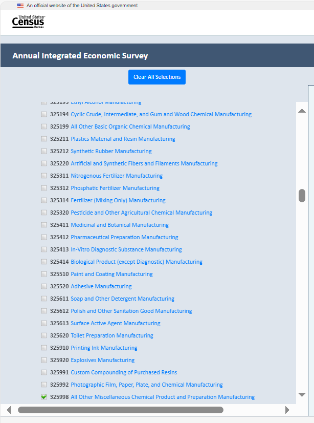 Then searching for NAICS 325998 (All Other Miscellaneous Chemical Product and Preparation Manufacturing)