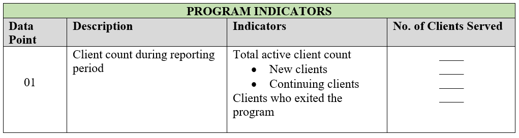 Reporting: Indicate the total active, new, continuing, and exiting clients during the reporting period.