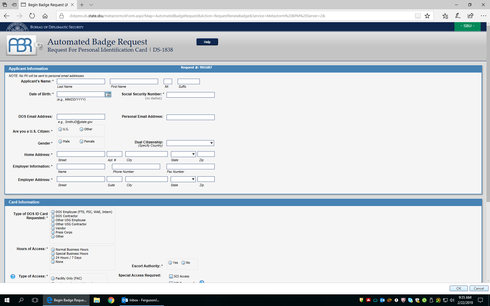 Request for Department of State Personal Identification Card