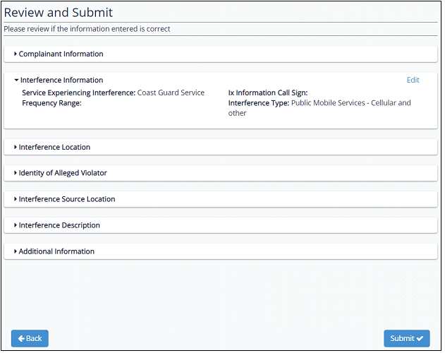 After completing all form sections, users will be taken to the Review and Submit section. In this section, users may review the information entered and make edits as necessary. Once the complainant reviews all the information, click the checkbox presented, and you will then be able to submit the complaint.