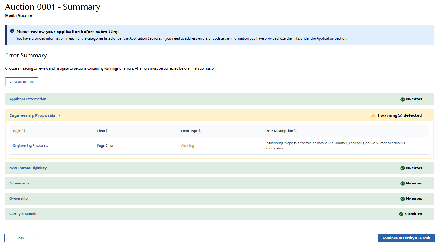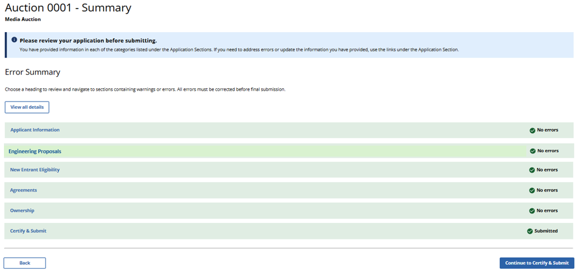 (Error Summary With No Errors Detected as Displayed to Broadcast Non-Table Service Auction Applicants)