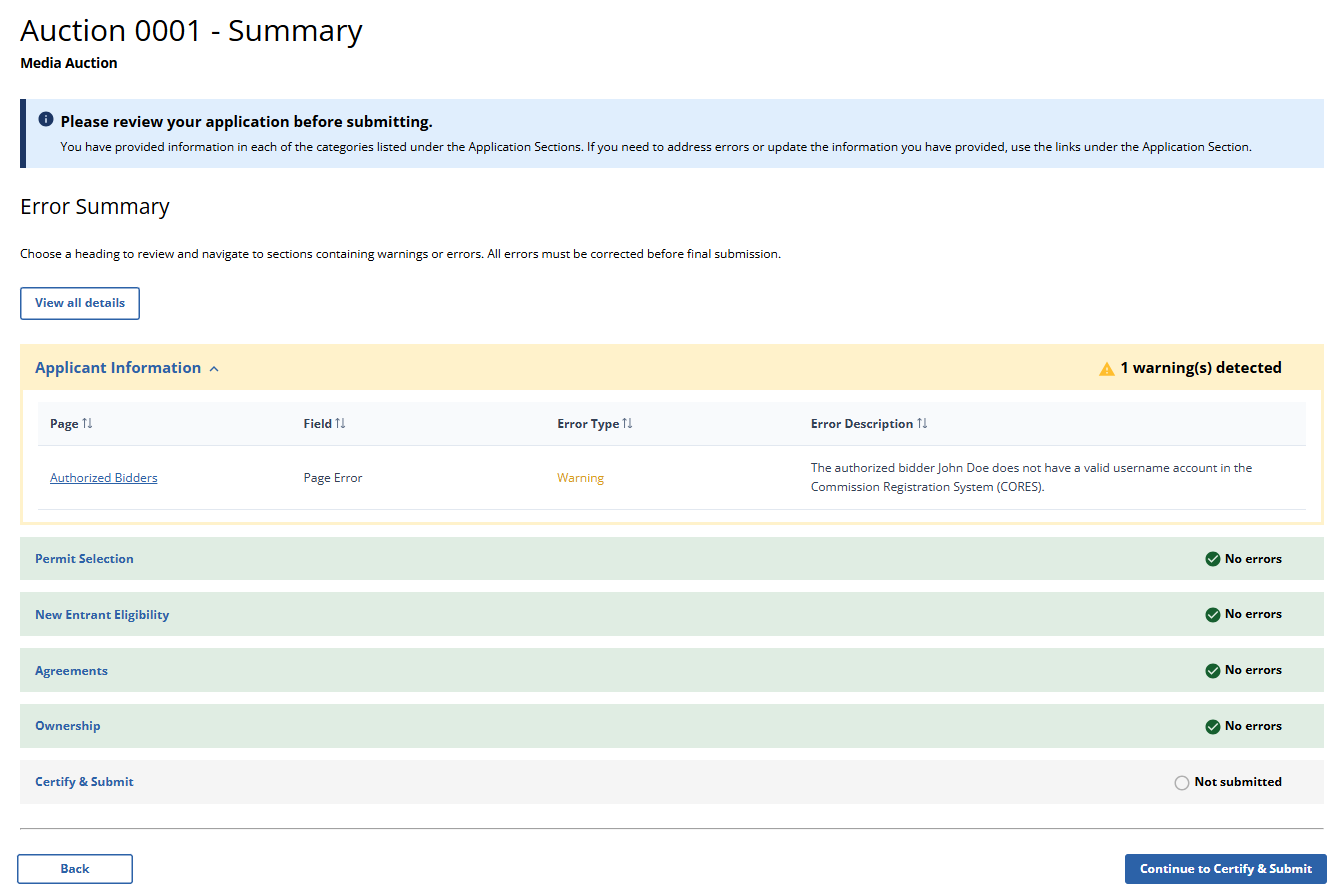 (Error Summary With No Errors Detected as Displayed to Wireless Auction Applicants)