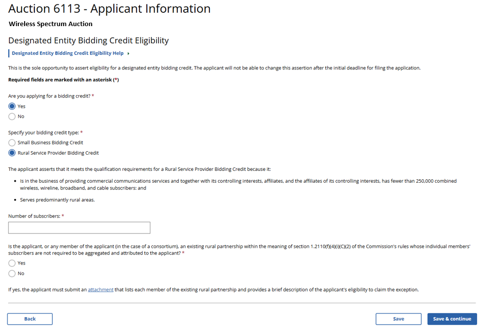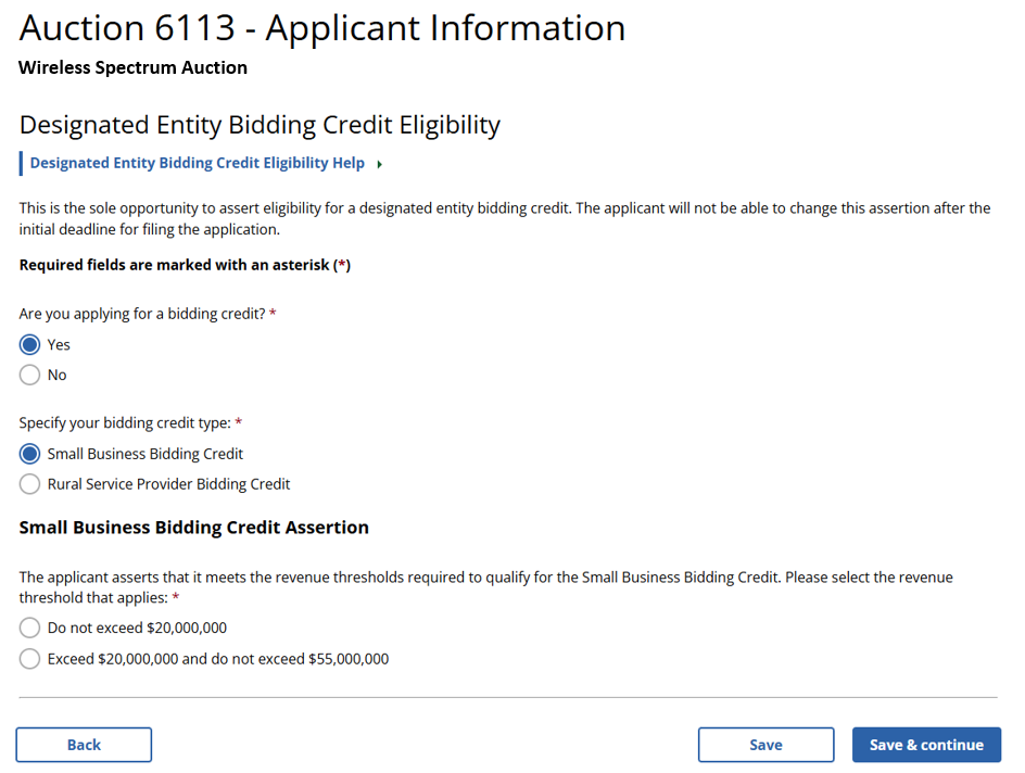 (Displayed Only to Wireless Auction Applicants Seeking a Small Business Bidding Credit or a Rural Service Provider Bidding Credit)