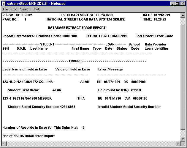 Data field errors that appear on your Load-Process Error Report usually require that you make changes to the respective field(s) in your database before your next extract, (e.g., a typographical error for the Date of Disbursement where your system field had 1896-01-25 instead of 1996-01-25. In this instance, NSLDS would reject that date as being prior to the loan program’s existence). In your next Submittal file, you must submit a Past Period Change with a Date of First Disbursement of 1996-01-25.