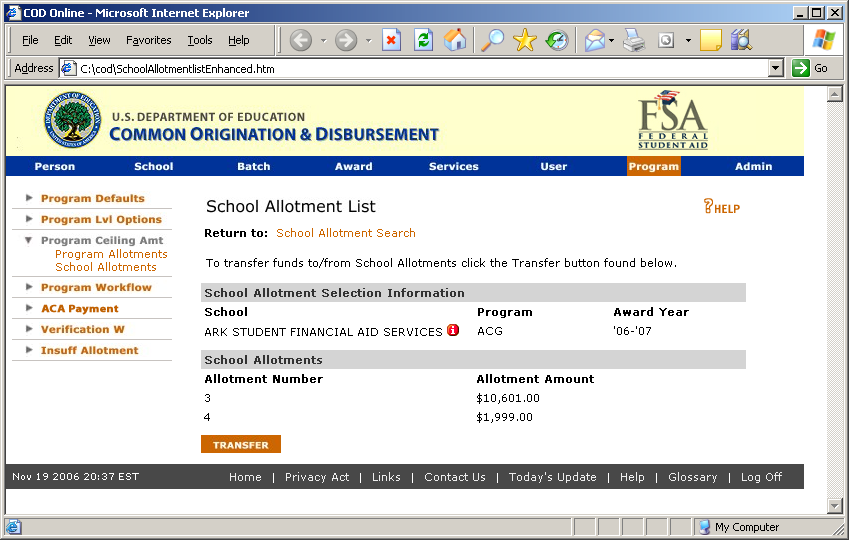 The Program Allotment Transfer page will allow authorized users to transfer and add ACG funds within program allotments.