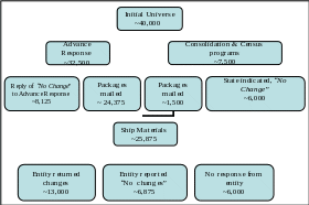 The estimated hours of burden were established using the following criteria (see figure 1). There are approximately 40,000 governmental units included in the initial BAS universe (please see figure 1). Of those 40,000 potential respondents, there are 32,500 that are included in advance response. The 7,500 remaining respondents are covered by consolidations and Census programs such as Special Census and Geographically Updated Population Certification Program (GUPCP). Of these 7,500 respondents, the Census Bureau mails packages to approximately 20% which is 1,500 respondents. Of the 32,500 advance responses, the Census Bureau mails packages to approximately 75% or 24,375 respondents. Between Advance Response and consolidations, the Census Bureau mails packages to roughly 25,875 respondents.