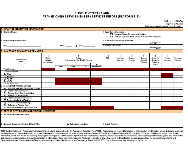 OMB Burden Statement: These reporting instructions have been approved under the Paperwork Reduction Act of 1995. Persons are not required to respond to this collection of information unless it displays a currently valid OMB number. Obligation to respond is required to obtain or retain benefits (Workforce Investment Act [Section 185(a)(2)], Wagner-Peyser Act [29 USC 49i] and Trade Adjustment Assistance [20 CFR 617.61]). Public reporting burden for this collection of information, which is to assist with planning and program management and to meet Congressional and statutory requirements, includes time to review instructions, search existing data sources, gather and maintain the data needed, and complete and review the collection of information. Send comments regarding this burden estimate, or any other aspect of this collection, including suggestions for reducing burden, to the U.S. Department of Labor, Employment and Training Administration, Office of Performance and Technology, Room S-5206, 200 Constitution Avenue, NW, Washington, DC 20210.