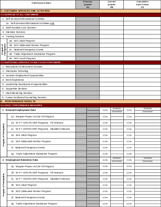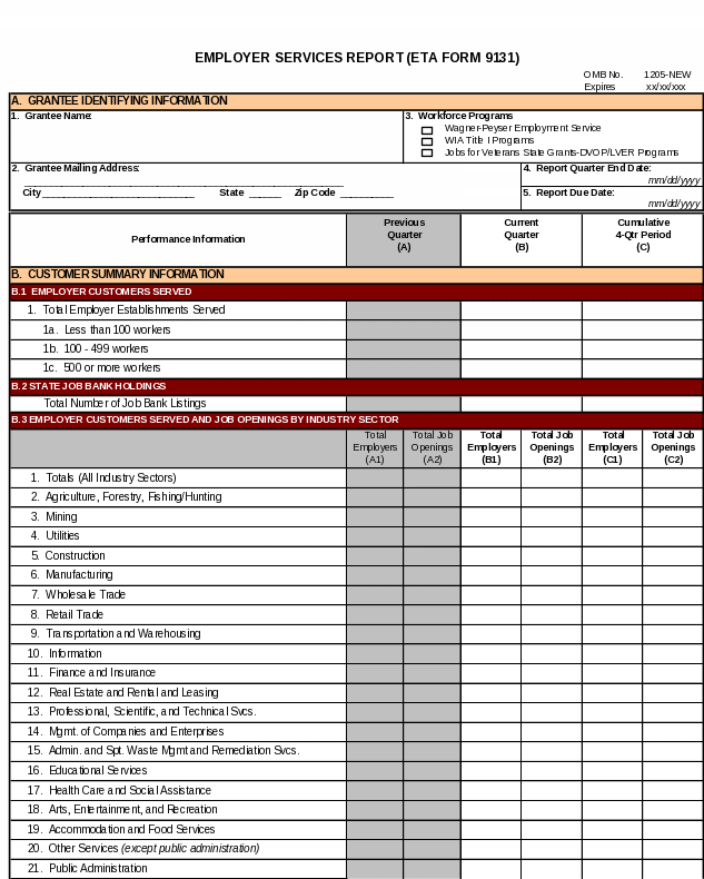 Quarterly Report on Services to Employer Customers: Contains a uniform report format and set of related instructions that support grantee reporting on the levels of employer participation in the One-Stop delivery system and the types of services provided to this important customer.