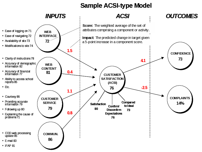 The impacts derived from the model will be used by FSA in conjunction with the component scores to target the best areas for strategic change and improvement. Along with its value as a benchmarking tool, the ACSI methodology also provides agencies an additional benefit in the statistically reliable, customer-driven, quantitatively derived measures of where improvements will have the most leverage on customer satisfaction and, in turn, on desired customer behaviors. This information allows the Department of Education to allocate its resources in such a way to maximize the return on improved customer satisfaction for its investments in internal processes.