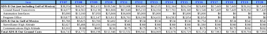 The Federal government will incur costs to provide ADS-B surveillance uplink and downlink services, TIS-B and FIS-B services. Since these costs are incurred in order to provide data on aircraft they are all considered data collection costs. The costs that the government would incur for ADS-B Out include the costs of the ground-based transceivers (GBTs), automation interfaces and program office costs. These costs are presented below for each year. Costs to provide ADS-B Out surveillance for high altitude operations in the Gulf of Mexico are presented separately below and include cost of providing equipment for surveillance and for communications.