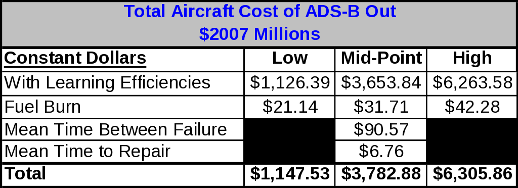 The following table shows the range of total costs for a ADS-B Out compliant transponder. These costs include the sum of the unit, maintenance, installation and certification costs. These costs do not include the cost of upgrades for future navigational aides such as ADS-B In.