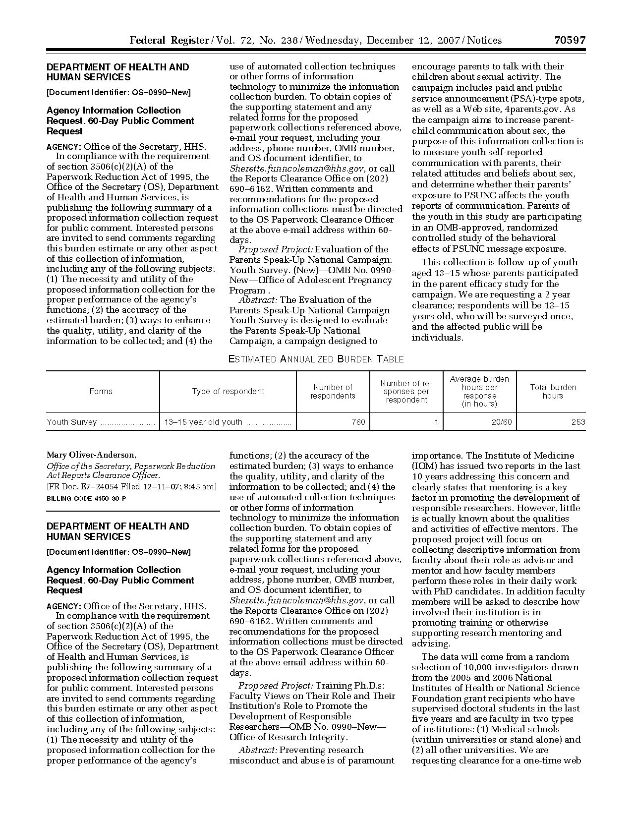 The Parents Speak Up National Campaign is a new media campaign. The evaluation is also new and therefore does not duplicate previous efforts. In designing the proposed data collection activities, we have taken several steps to ensure that this effort does not duplicate ongoing efforts and that no existing data sets would address the proposed study questions. To ensure that this study is forging new ground in our understanding of the efficacy of the Parents Speak Up National Campaign public service announcements, we conducted an extensive review of the literature by examining several large periodical journal databases. We identified published articles or books containing the keywords “adolescent,” “youth,” “abstinence,” and “parent-child communication.” In addition to reviewing published information, we searched for “gray” literature by contacting well-known researchers in the field and by exploring the Internet. Searches were performed on several Internet search engines, including Google, Yahoo, AltaVista, Medline, and Science Direct, using search terms “adolescent,” “youth,” “abstinence,” and “parent-child communication.”
