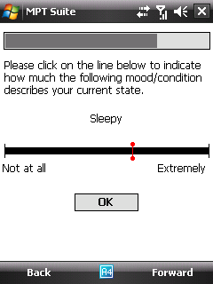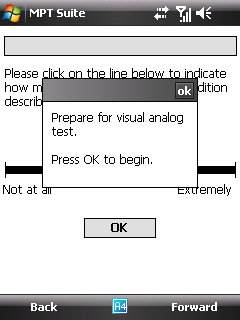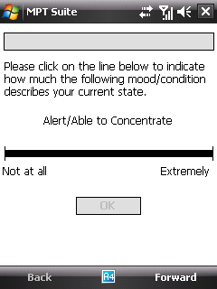 There are currently four tasks in the testing suite. The first task, the Visual Analog Scales (VAS) task presents a user with a series of moods/conditions and asks them to indicate how much the prompt describes their current situation. (Figure 16) A response from the user is a number between 0 and 100 determined by the location the user clicks along a horizontal line. The line is bounded by two semantic tags, ‘Not at all’ and ‘Extremely’ that represent the extremes of responses to the prompt. (Figure 17)