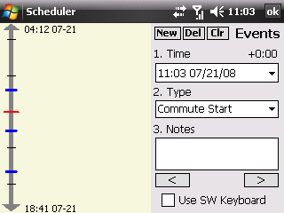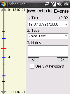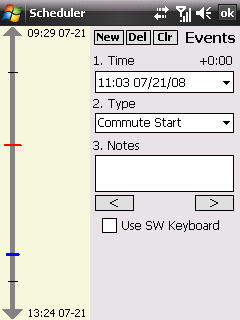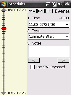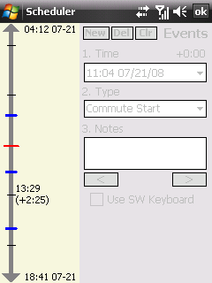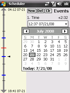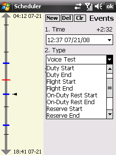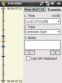 Time on the timeline is expressed in two forms: local time and an offset from the current time. Pressing the stylus on the area to the right of the timeline and moving up/down will cause these times to be shown. (Figure 5) If the stylus passes over a blue event marker, this event will automatically be loaded and its data displayed in the area on the right-hand side of the screen. (Figure 6) A loaded event is indicated though a small triangle located to the right of the blue event marker.