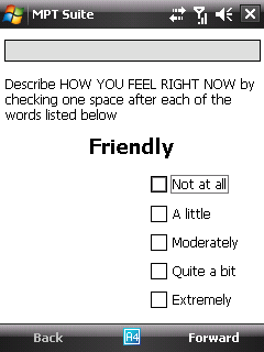 The second task available on the mobile platform is the Profile of Mood States (POMS) task. In this task, the user is asked to indicate how much, on a semantic scale, a particular word describes their current feeling/state. A series of these word prompts are given to the user and automatically advance after the user chooses a semantic level. (Figure 18)