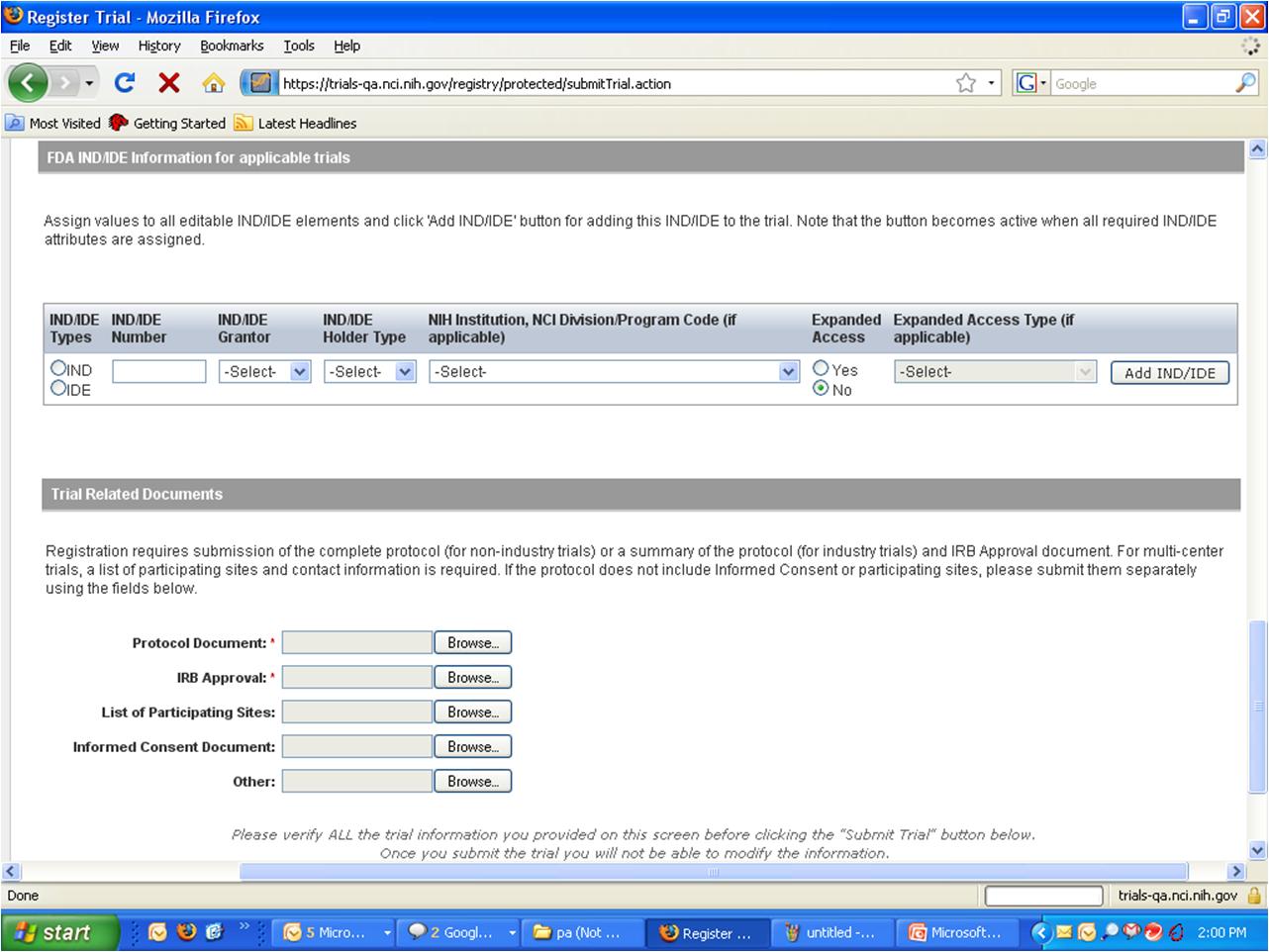 User selects to perform “Initial Trial Registration” and completes initial registration – see screenshots, pages 5 - 9, OR